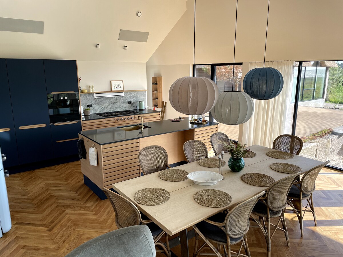 Entre em contato com a natureza novamente nesta casa inesquecível. Construída com uma abordagem intransigente e escolha de materiais em estilo nórdico. Casa de 207 m2 com 3 banheiros e um toalete extra. Grande sala de jantar e cozinha combinada com sala de estar. Terraço de 120 m2, além de um terraço coberto de 8 m2. Sauna e sala de atividades de aprox. 25 m2. Cozinha rústica e lavanderia. Piso aquecido e sistema de ventilação em todos os cômodos. Acesso sem degraus. Cafeteira Sage, tênis de mesa, 1 caiaque, 2 pranchas de paddle, alvo de dardos, rede.