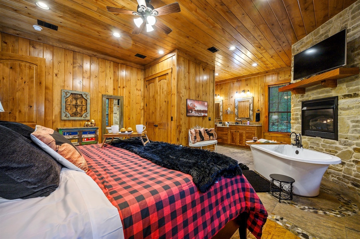 Cabana de luxo e moderna de 3 quartos com banheira de hidromassagem, lareira.