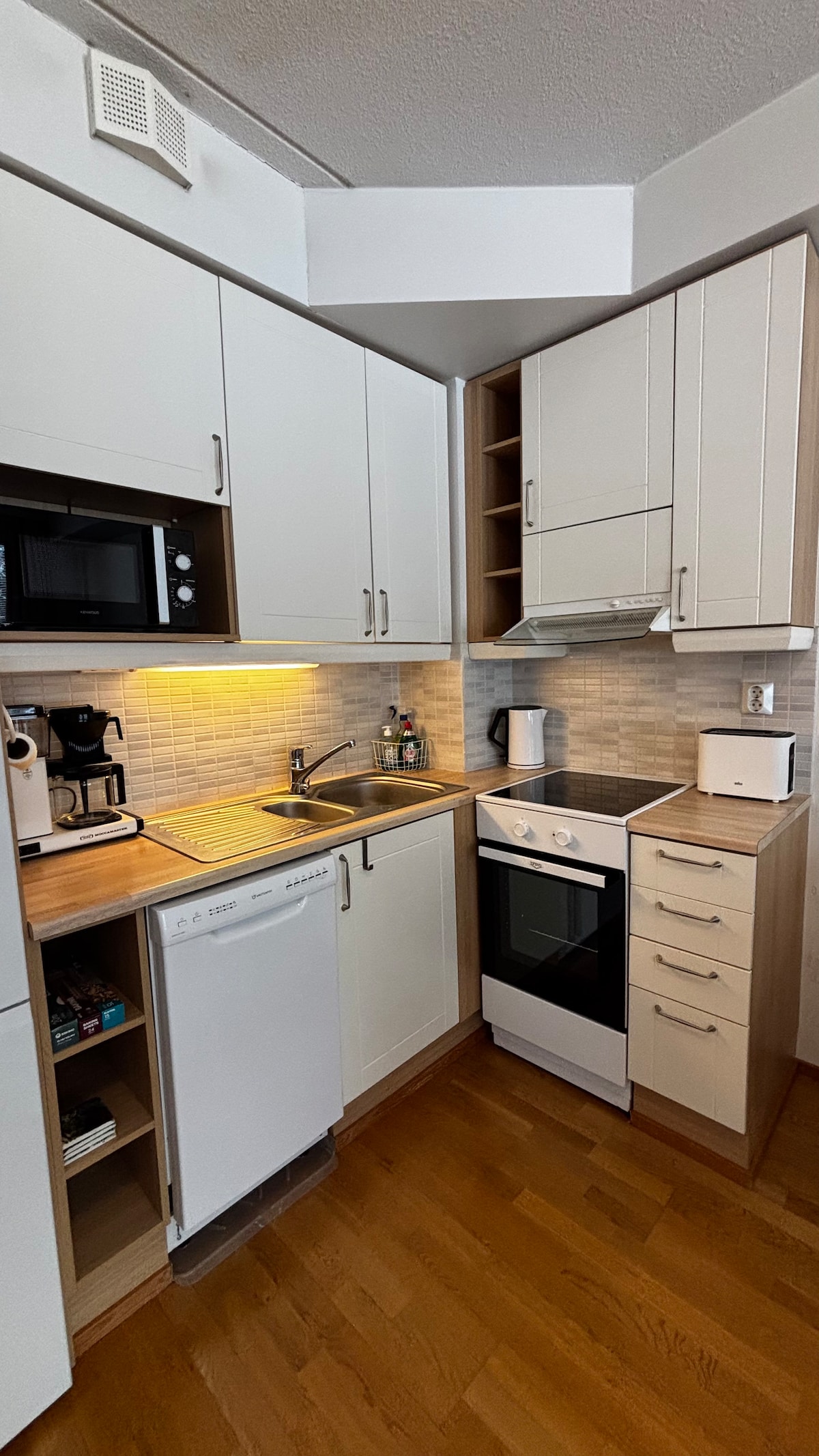 A spacious 4th-floor one-bedroom apartment in the center of Oulu. The apartment is located right next to the train station, so everything is within walking distance. The apartment is furnished with high-quality furniture and materials. The kitchen is equipped with all the essential cooking tools. Bed linens and towels are always included in the price. The apartment can accommodate up to five guests. Free parking is available in the inner courtyard of the building.