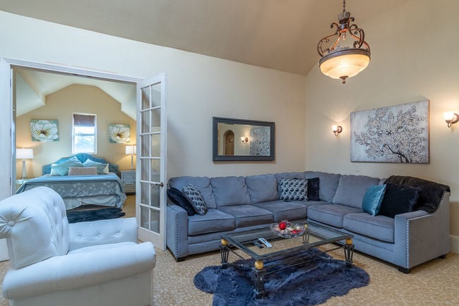 Experimente todo o piso superior do Chateau Coralini nesta suite King de cobertura de sonho com uma sala de estar privada, banheira de imersão, vistas deslumbrantes e comodidades exclusivas. Desfrute de uma cama de dossel romântica, um recanto aconchegante com vista para as fontes e as luzes da cidade de Salinas, e o conforto do aquecimento e arrefecimento. Perfeito para escapadelas românticas, fins de semana prolongados e hóspedes que procuram uma estadia espaçosa, privada e inesquecível perto de Monterey e Carmel.