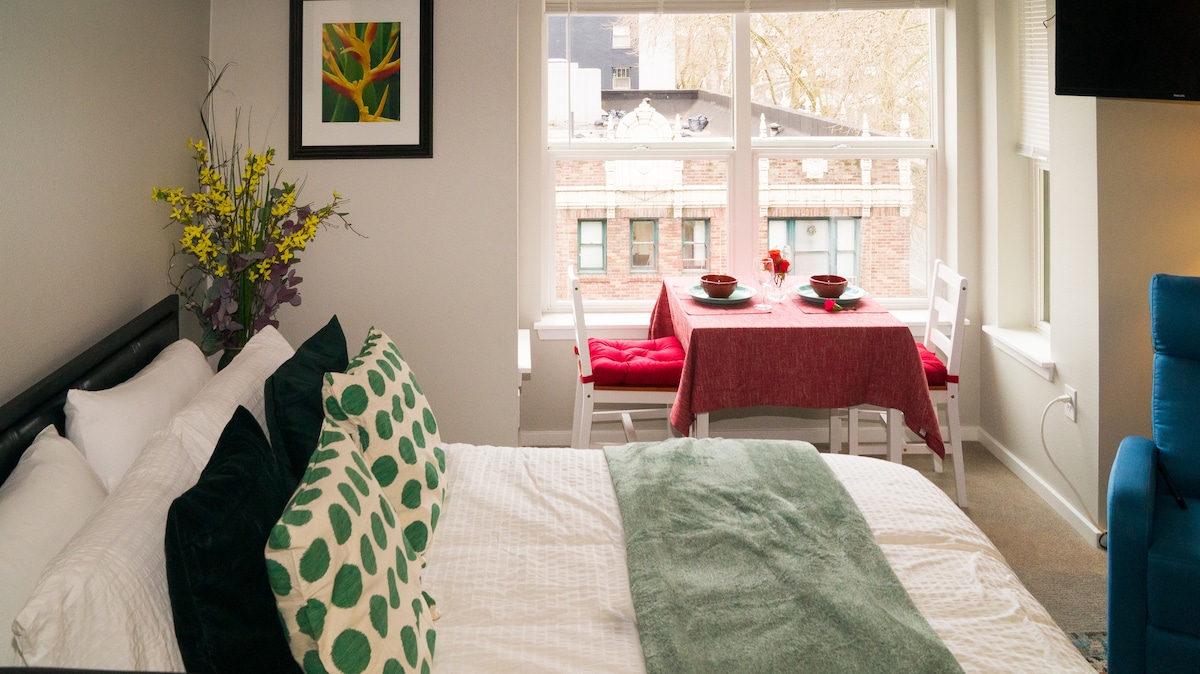 NOVA RENOVAÇÃO (concluída em março de 2024) + A DUAS QUADRAS da Space Needle. Nova kitchenette/casa de banho/piso/mobiliário. Localização perfeita para uma experiência urbana em Seattle. A uma curta caminhada do Space Needle, do Chihuly Glass Museum, do EMP Museum, do Pike Place, da Amazon, do South Lake Union e de muitos outros locais. Ótimos restaurantes e bares nas proximidades! Cama de casal, Wi-Fi de alta velocidade. Sem forno/fogão/máquina DE lavar louça. Fogão portátil fornecido. Sem ar condicionado (há ventoinhas. O ar condicionado portátil é fornecido para julho/agosto).