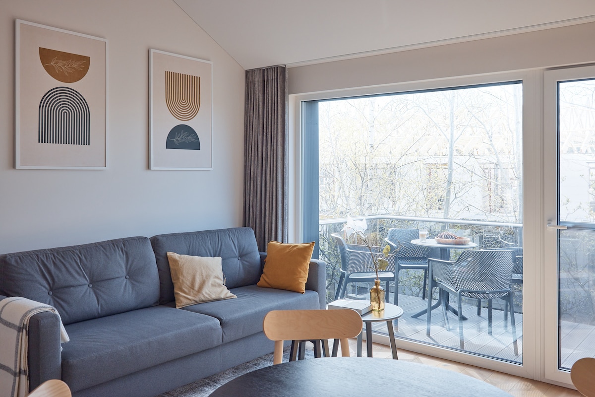 Apartamento novo e elegante com um terraço privativo no coração de Palanga – na Rua Daukanto. Dispõe de uma sala de estar com um sofá-cama, cozinha completa, casa de banho e terraço. A poucos minutos da praia. Perfeito para até 4 hóspedes.