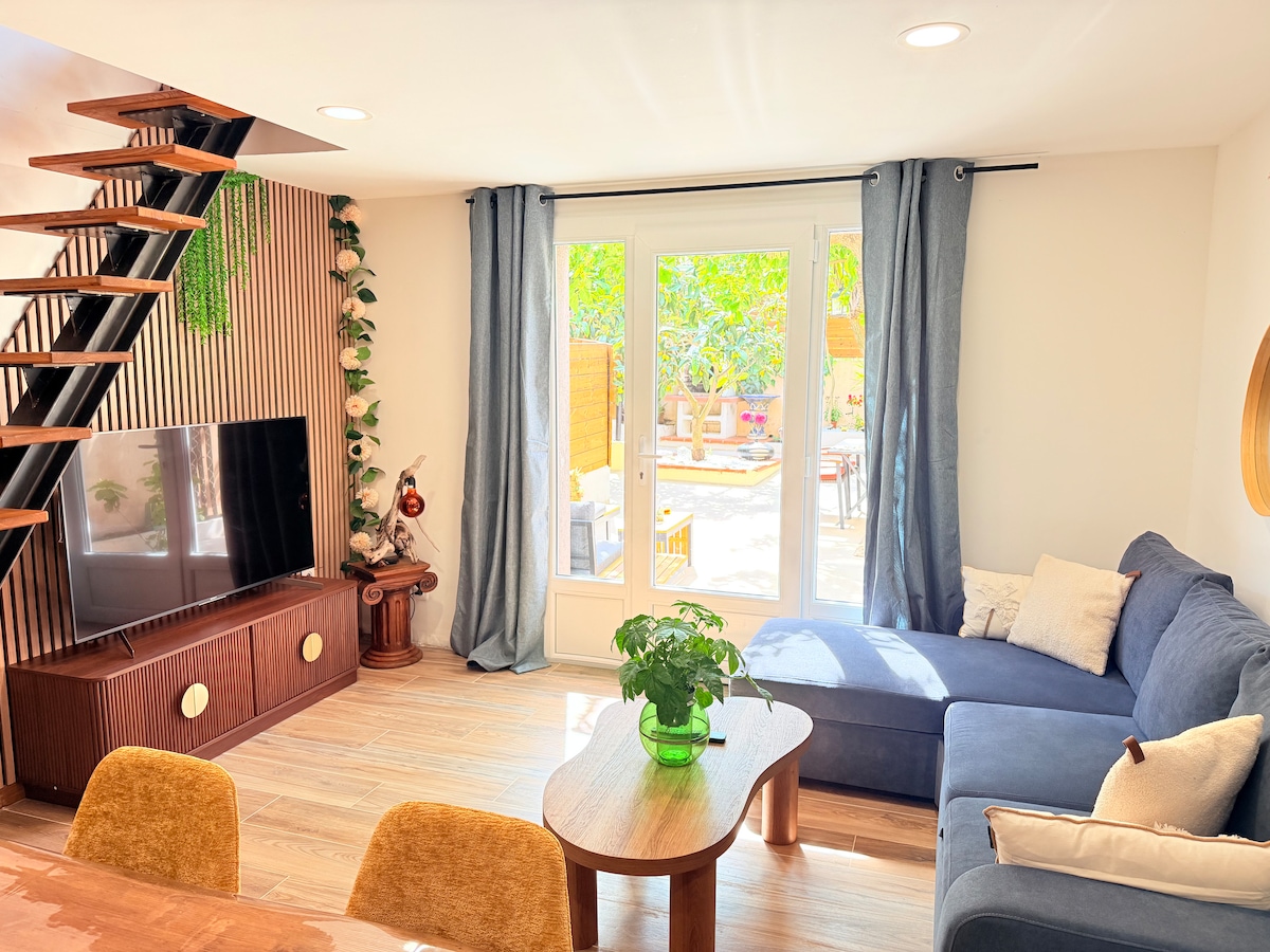 Nossa acomodação oferece uma vista magnífica da montanha. Você compartilhará conosco uma piscina de 6 x 3 m. A praia é acessível a pé. Totalmente reformado por nós, com uma decoração única e requintada. Você tem 2 camas de solteiro no quarto e um sofá-cama 140 X 190 na sala de estar. O terraço está equipado com poltronas, mesa, cadeiras, churrasqueira. Isolado em um enorme jardim, você estará em absoluta tranquilidade. Seus filhos e animais de estimação poderão circular com total segurança
