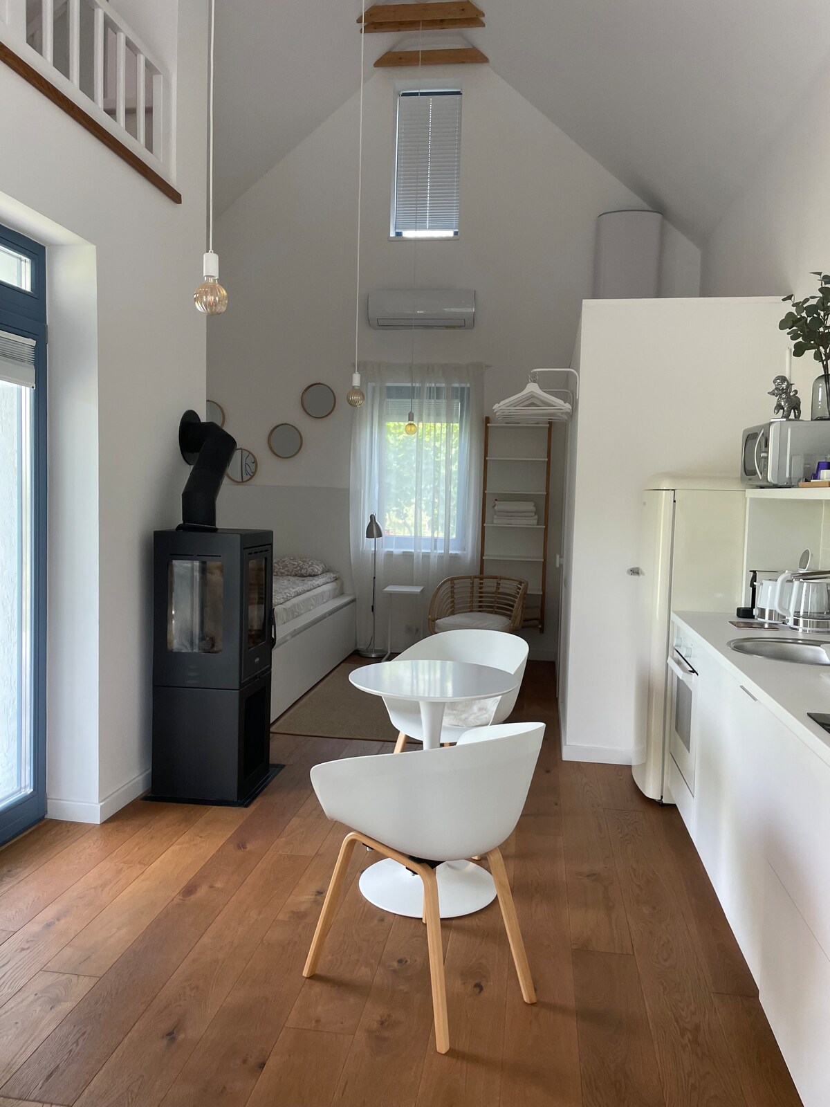 Um apartamento estúdio moderno e confortável em Alsóörs, perto da costa do Lago Balaton. Num espaço aéreo, há uma área de dormir, um sofá, uma kitchenette, um frigorífico e uma televisão, e uma casa de banho espaçosa e sofisticada numa divisão separada. É a escolha ideal para casais, ciclistas ou viajantes que procuram um refúgio confortável "Sleep&Go". Equipado com ar condicionado, também é adequado para estadias mais longas.