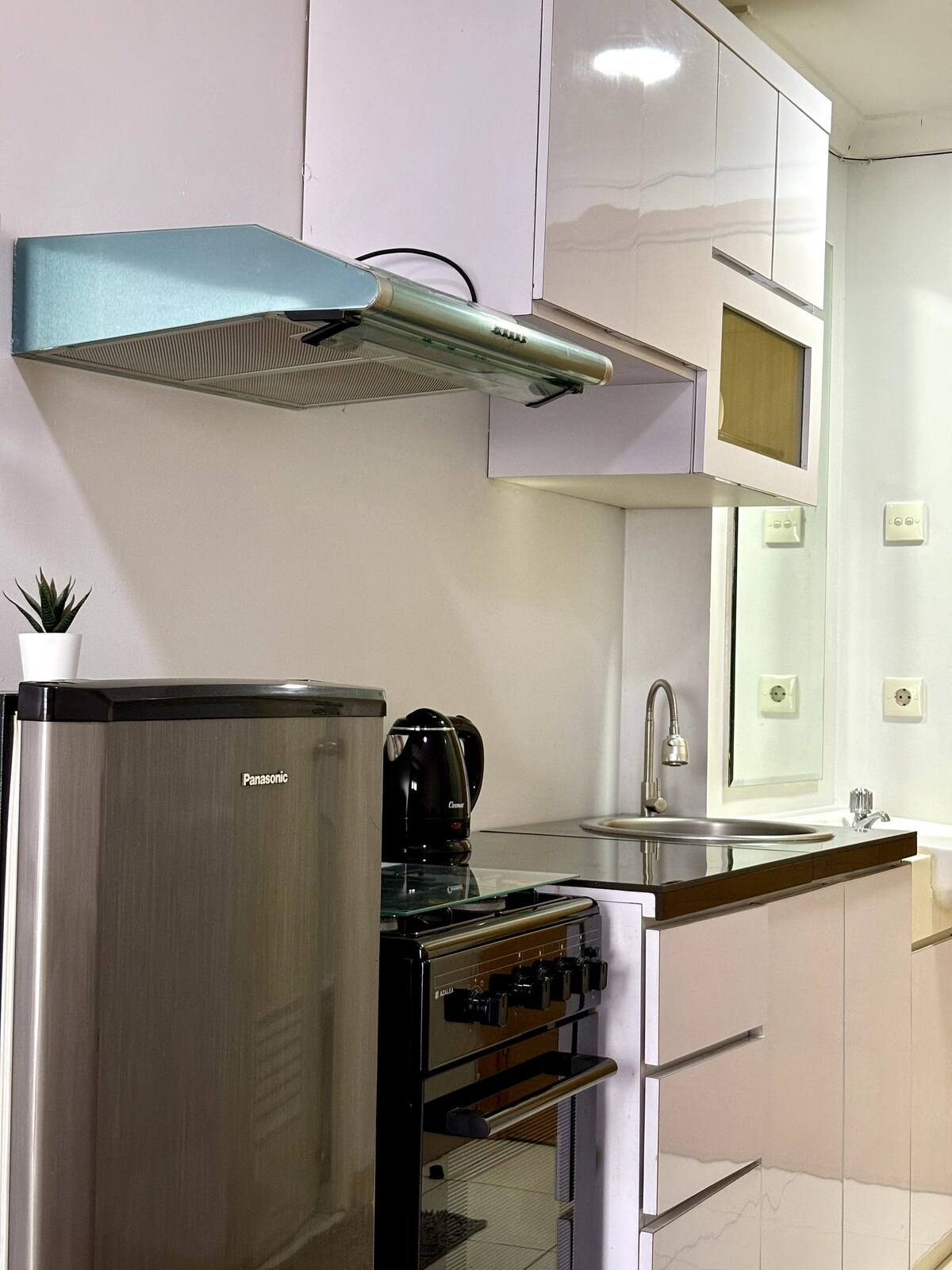 Um elegante estúdio de 24 m² no centro de Jacarta, combinando estilo e conveniência. Inclui cozinha, Wi-Fi rápido, purificação de ar, smart TV de 43", sistema de som e Netflix. É ideal para vários tipos de estadias, com acesso sem contacto e comodidades como piscinas, jacuzzi, ginásio e basquetebol. Agora possui um dispensador de osmose reversa e eliminação de resíduos alimentares, A imagem mostra um fogão a gás que foi substituído por um fogão de indução (para seguir as diretrizes do apartamento para riscos de incêndio)
