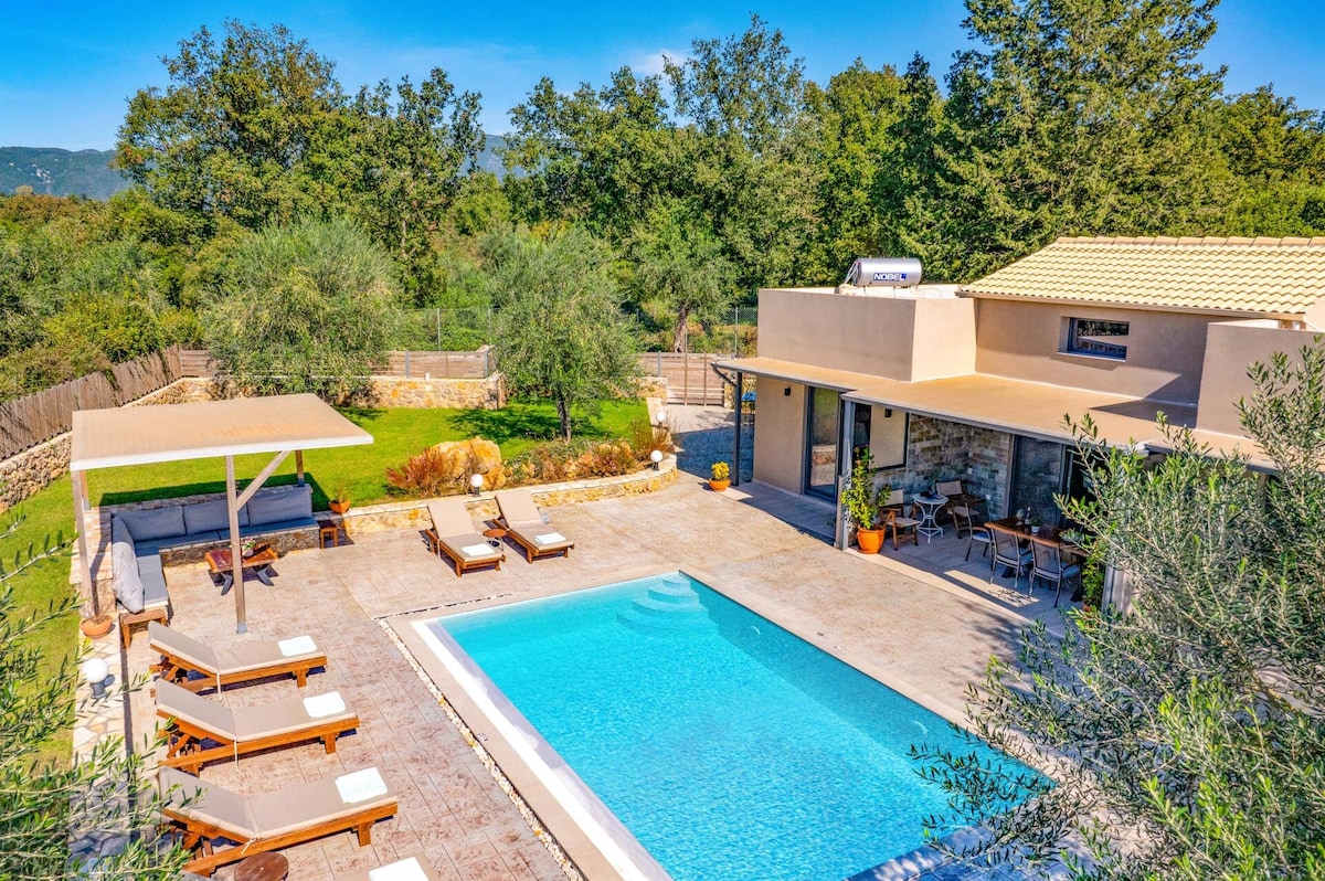 Acomoda 2/3. Casa de um quarto com piscina privativa. A casa de campo Petrinos é o retiro rural perfeito. Uma vila tradicional de pedra com um telhado de terracota, fica em um lindo terreno verde com árvores e belos jardins.