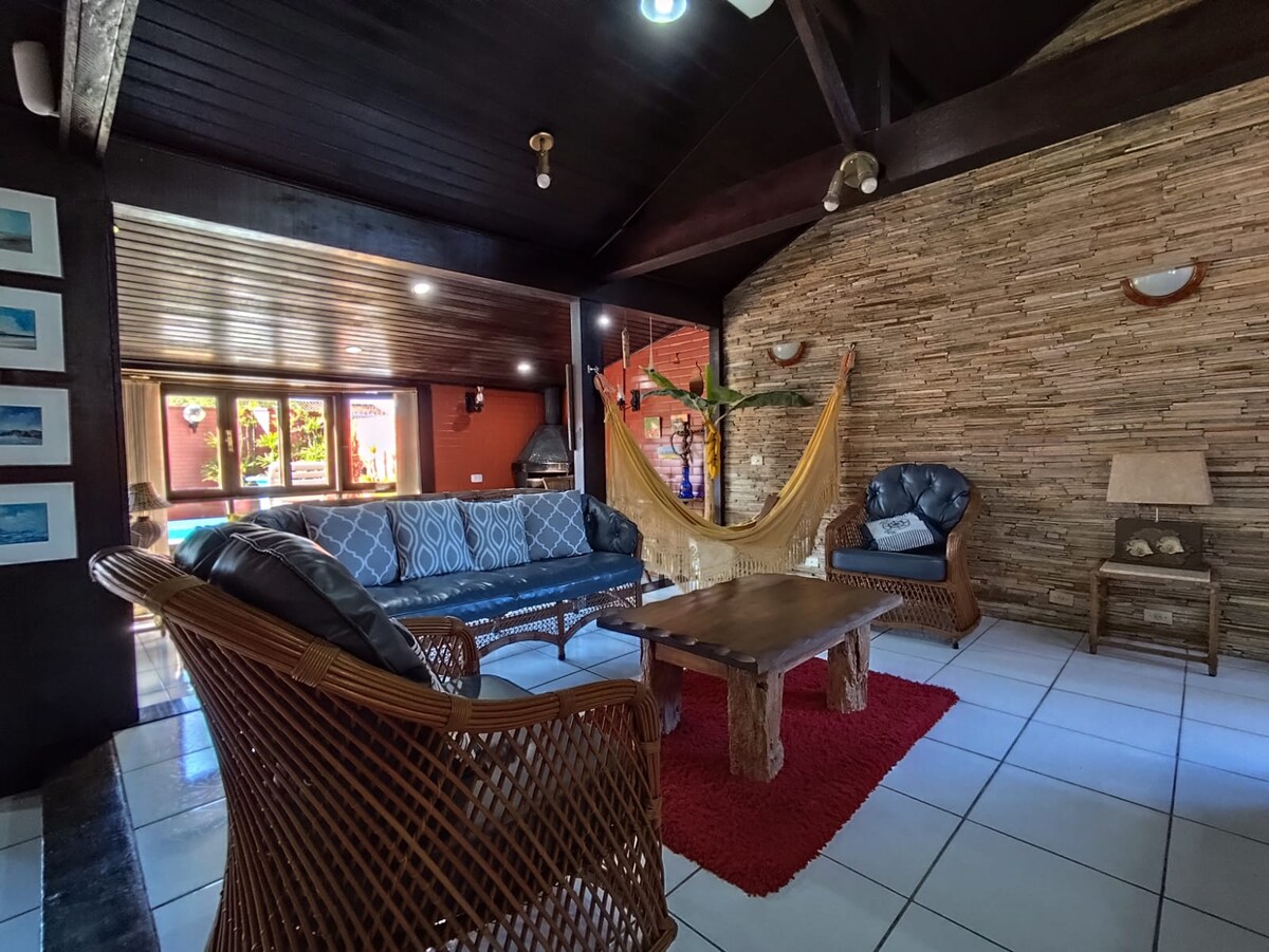 #Local super gostoso repleto de pássaros onde o beija-flor chega bem pertinho de você. #Com um espaço reservado para você curtir aquele sol. #Varanda onde você pode contemplar a natureza, fazer suas refeições e descansar na rede. # Terreno gramado com muitas árvores onde as crianças e o seu cachorro podem brincar e correr a vontade. #Cozinha completa com churrasqueira e sala ampla com Tv e wi-fi. # Localizado próximo a Ponta da Pita. # Estacionamento para 2 carros só não é coberto