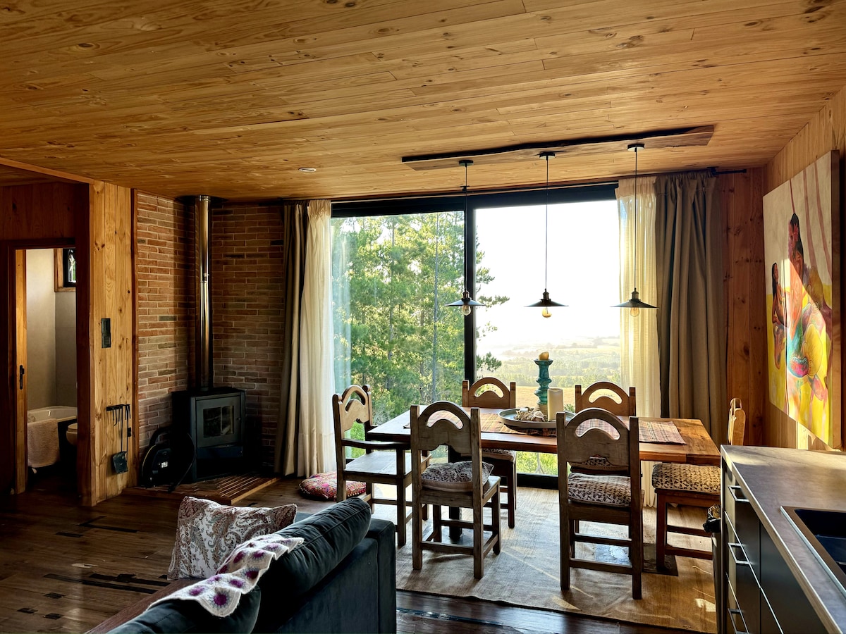 Wooden cabin with hot tub & Starlink, overlooking Cáhuil Lagoon and native forest. Secluded for silence, yet close to beaches, sightseeing, restaurants, and shops for all essentials. Features sunny terraces, skate ramp, fire pit, and gas/wood BBQs. Full cell signal and fast WiFi make it the perfect nature getaway. During winter season with rain a 4x4 car is recommended.