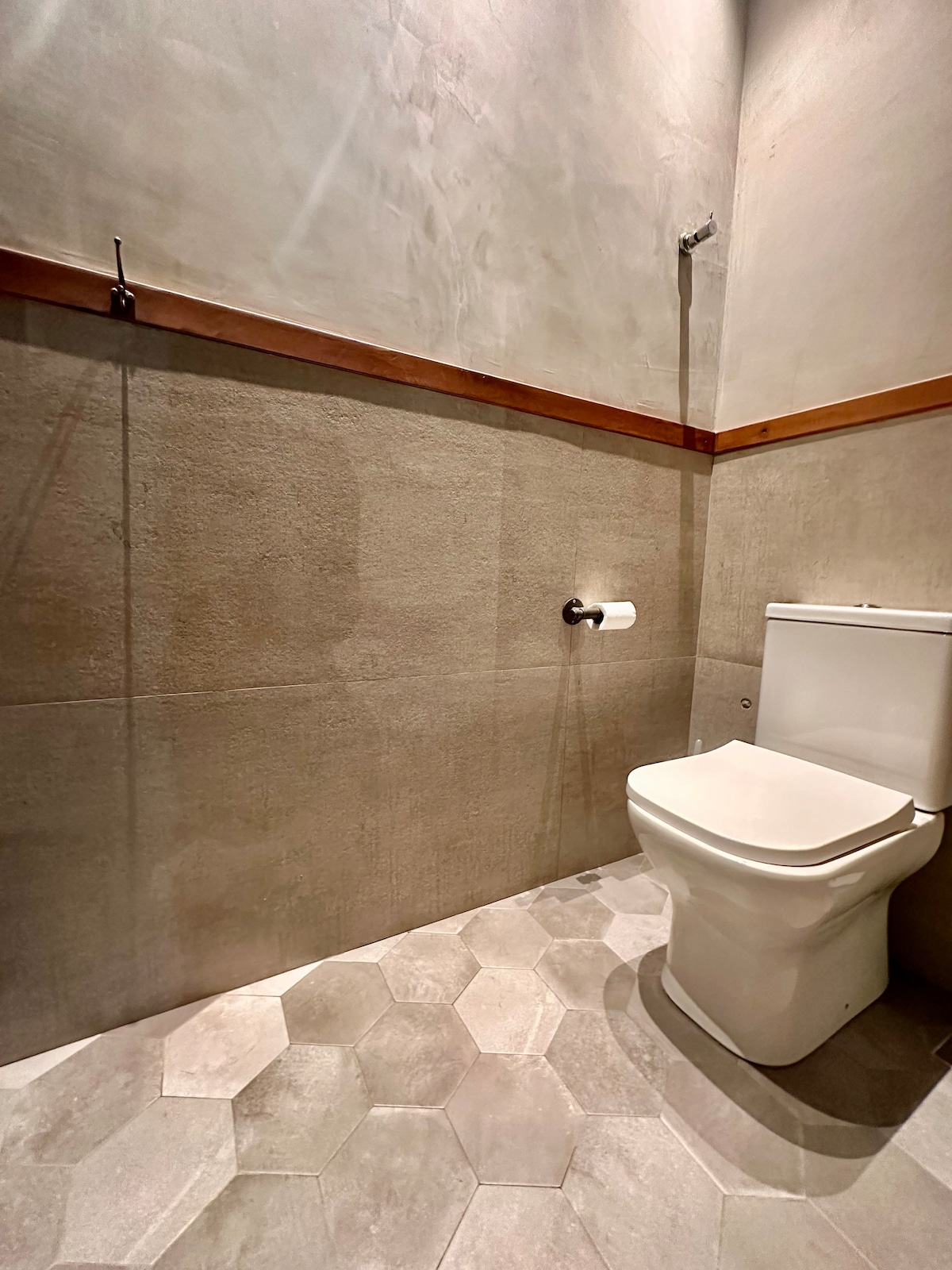 No térreo tem 1 quarto e 1 banheiro ao lado, 1 banheiro externo para piscina e mais 1 banheiro perto da cozinha, mais 1 dependência (sem ar condicionado) que seria o décimo quarto, mas este não contabilizamos. No primeiro andar tem 1 suíte principal, ao lado da suíte tem 1 quarto e 1 banheiro no corredor. No primeiro andar tem também 3 apartamentos, cada um com 2 quartos 1 banheiro, sala e varanda. (Total são 9 quartos climatizados e 8 banheiros)