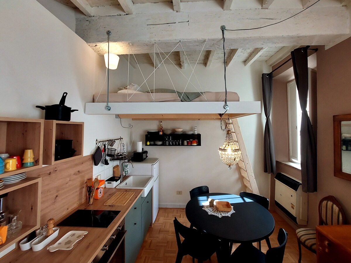 Loft/Cobertura localizado no centro da cidade, ao lado da histórica Piazza Garibaldi, o coração pulsante de Parma. A cobertura foi projetada por um conhecido arquiteto, que tornou este espaço único. A área de estar com uma sala ampla e bem iluminada tem vista para os telhados de Parma e conta com um terraço exclusivo. Para completar, uma maravilhosa cozinha projetada sob medida. Quarto de casal moderno com guarda-roupa e banheiro com banheira de hidromassagem para relaxar após um dia frio de inverno.
