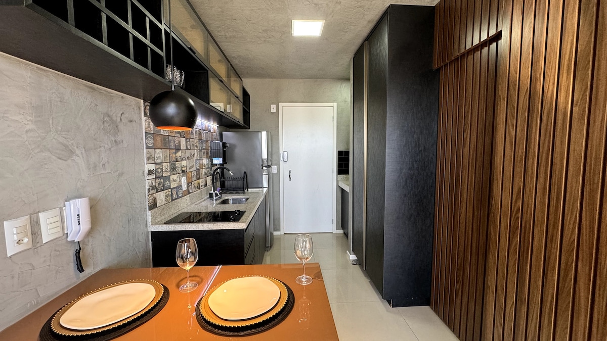 Apto 45 m2. Quarto:Cama Queen,armários,bancada escritório,TV 4K 50”,ar-cond.,roupa de cama/banho. Sala: sofá cama,TV 4K 50”,ar-cond.,mesa e 4 cadeiras design italiano. Cozinha:armários,bancada,cooktop 4 bocas,geladeira,forno elétrico,forno microonda,cafeteira elétrica,filtro água,sanduicheira, panelas,utensílios. Piscina borda infinita, hidro,sauna,academia,brinquedoteca,salão festa,espaços gourmet. 1 vaga garagem. Portaria 24 horas porteiro e segurança. Temos outro apto