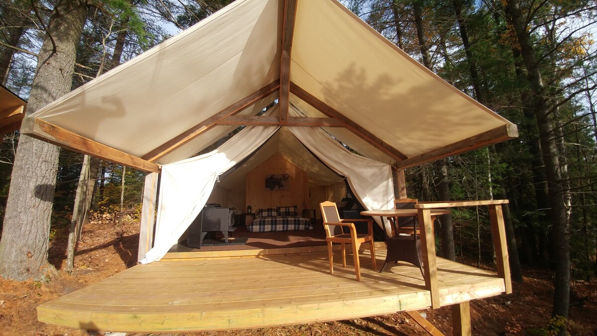 Waterfront Luxury camping at it's best. Sumptuous bed, bedding, table, chairs, etc., private on-suite washroom. . Explore our 100 Acre property. Private fire pit, deck and use of Canoe, kayaks and SUP's. If this Glamping site is not available for your dates we have 2 more sites. You will also have onsite access to ATV, Side by Side and Snowmobile tours.