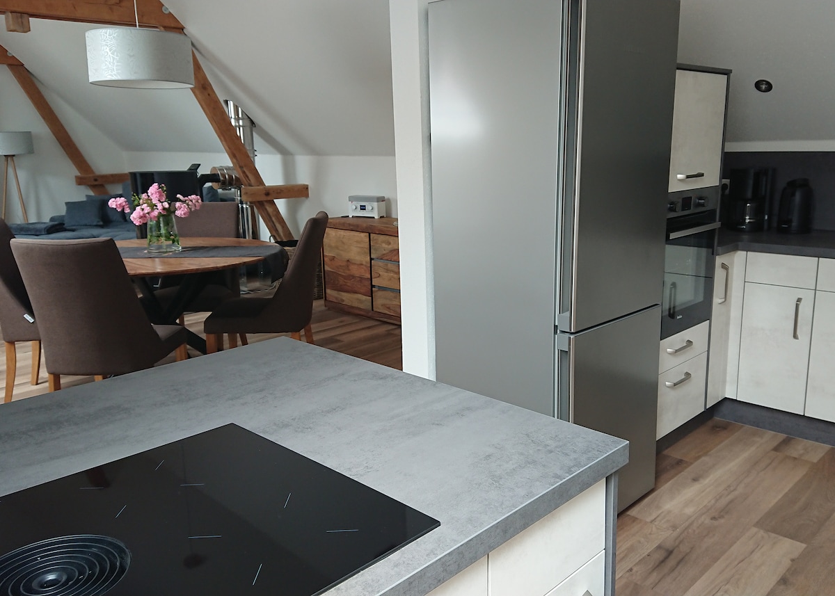 Nosso apartamento celeiro com ótimas camas dos tempos da bisavó está equipado com uma área de estar aconchegante, 2 TVs e Wi-Fi. O quarto pode acomodar 3 pessoas, mais 4 hóspedes na sala de estar. (Cama de casal 2x2m e sofá-cama 120x200). A cozinha convida a cozinhar. No banheiro há chuveiro, vaso sanitário e pia. O apartamento tem uma entrada privativa. Você mora sozinho em um ambiente muito tranquilo no celeiro ao lado do jardim. Nossa Wallbox no pátio garante o maior conforto para o carro elétrico.