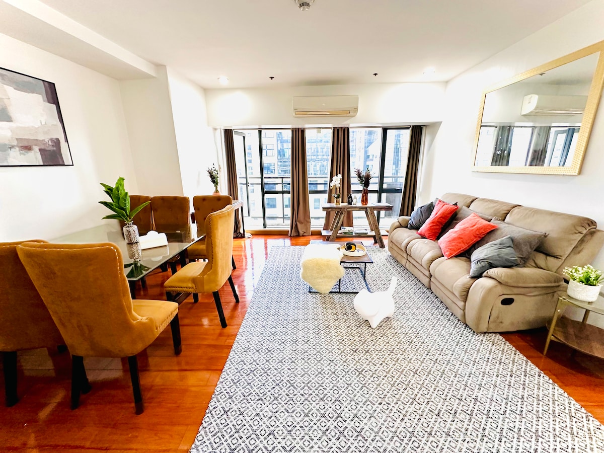 This stylish and spacious (2 bedroom and 3 bath) place is perfect for group/fam trips. Nestled in one of the most prestigious addresses in the country, The Milano Residences offers an exceptional blend of luxury, comfort, and convenience. With the low density of the condo and the corner location of the unit, your stay will feel very exclusive and chill. Burgos and Poblacion are within 10 minutes walk. Century City Mall is just around the corner. Powerplant mall is just 5 mins dr