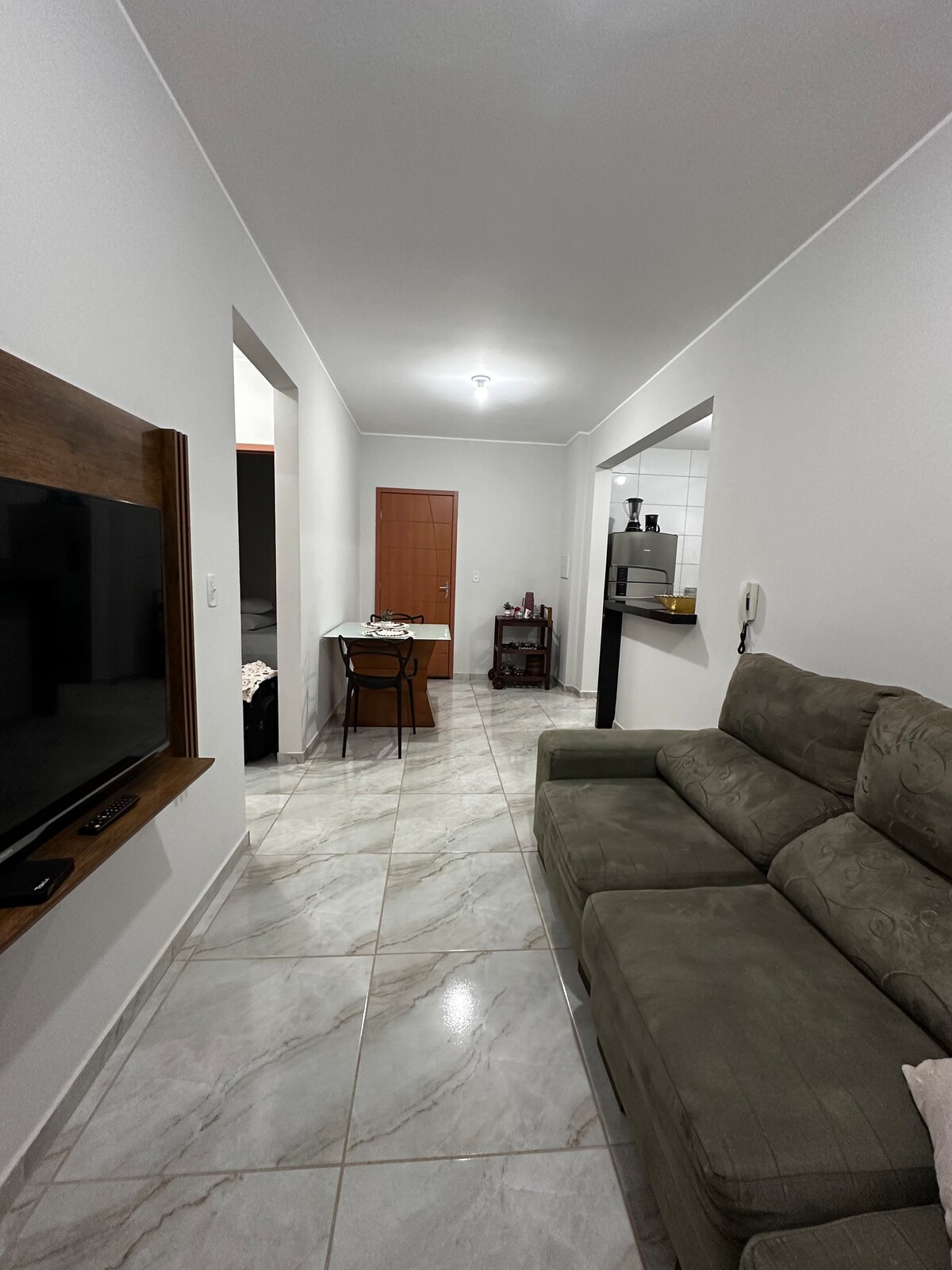 Apartamento novo, bem-localizado e de fácil acesso, em condomínio fechado, com portaria 24 horas. Possui 2 quartos (com ar-condicionado), 1 banheiro, cozinha, sala de estar (com ventilador, TV , internet 5G e Netflix ). Cozinha completa. Eletrodomésticos (liquidificador, espremedor de frutas, cafeteira, torradeira, sanduicheira). Ducha higiênica e box no banheiro. Roupas de cama e toalhas limpos. Tábua e ferros de passar roupa. Decorado com muito carinho!