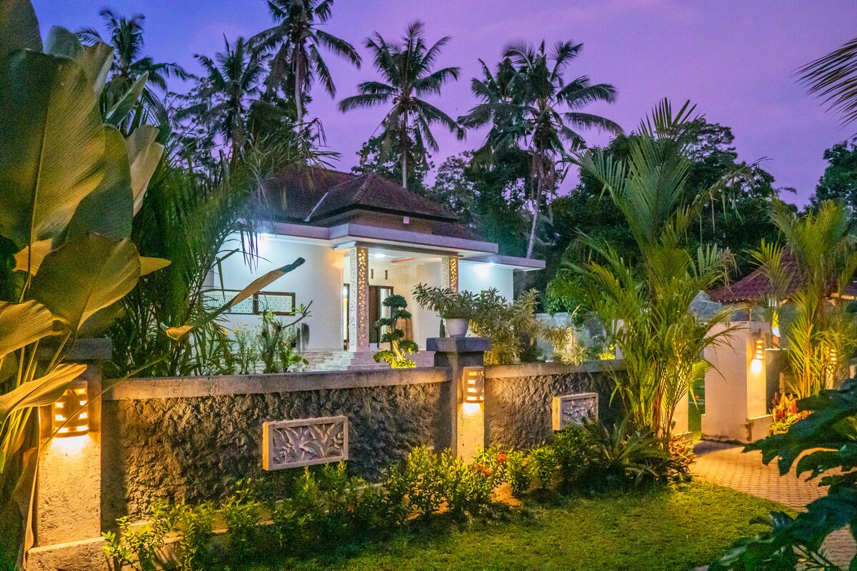Moradia romântica com jardim tropical localizada a uma curta distância a pé do centro de Ubud, 2 quartos: - um quarto com cama de casal e casa de banho privativa - outro quarto com cama de solteiro e também com casa de banho limpa também. com vista para um vale com vista para o rio: - bela e grande atmosfera, - Restaurantes e lojas estão a uma curta distância a pé, a apenas 200 metros da rua principal de Ubud: área muito segura com funcionários em torno de 24 horas. - Comodidades complementares e Wi-Fi na propriedade inserida,
