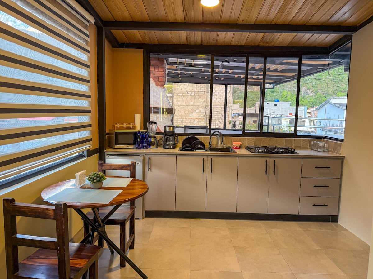 Um espaço elegante e acolhedor ideal para se reconectar e relaxar sozinho ou em família; o apartamento possui uma bela vista para o Rio Ambato, quartos com excelente iluminação, camas confortáveis e uma cozinha equipada. Um novo espaço, localizado numa localização estratégica em Ambato, a cinco minutos do centro da cidade e a dez minutos do setor industrial, uma área livre de energia que torna a sua conveniência, rede Wi-Fi, água quente, TV, estacionamento.