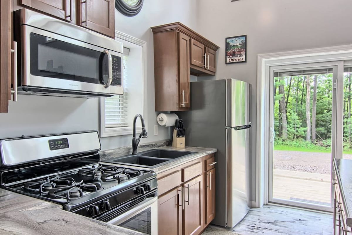 Desfrute do aconchego de uma era passada enquanto se hospeda nesta pitoresca cabana de madeira dos anos 1940. O Hawks Nest foi cuidadosamente restaurado à sua glória original, enquanto tem todas as comodidades modernas entrelaçadas através de seu espaço limpo de 380 pés quadrados. Retire-se para a espaçosa varanda coberta para relaxar e ver a propriedade de um acre e meio que leva a 100 pés de frente para o Lago 6Mile. Observe as estrelas enquanto relaxa nas confortáveis cadeiras douradas construídas pelos Amish ao redor da espaçosa área de fogueira de pavimentação.