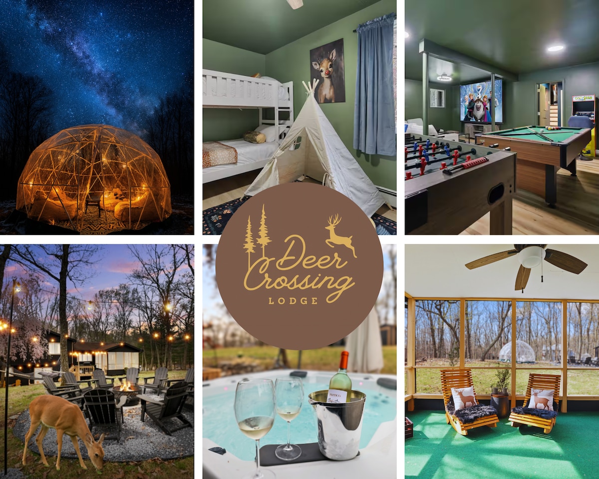 Uma estadia verdadeiramente única nas Montanhas Pocono, lar de terrenos montanhosos ondulantes, cascatas de tirar o fôlego, florestas prósperas, + 170 milhas de rio sinuoso. Criado com a experiência temática "a melhor noite em casa", os hóspedes podem saborear vinho sob as estrelas numa banheira de hidromassagem privada, além de desfrutar de filmes no seu próprio ecrã de cinema de 135 polegadas equipado com o primeiro projetor LED 4K do mundo. Desfrute de quartos temáticos e experimente uma estadia onde a floresta o leva embora enquanto se hospeda no máximo conforto + luxo.