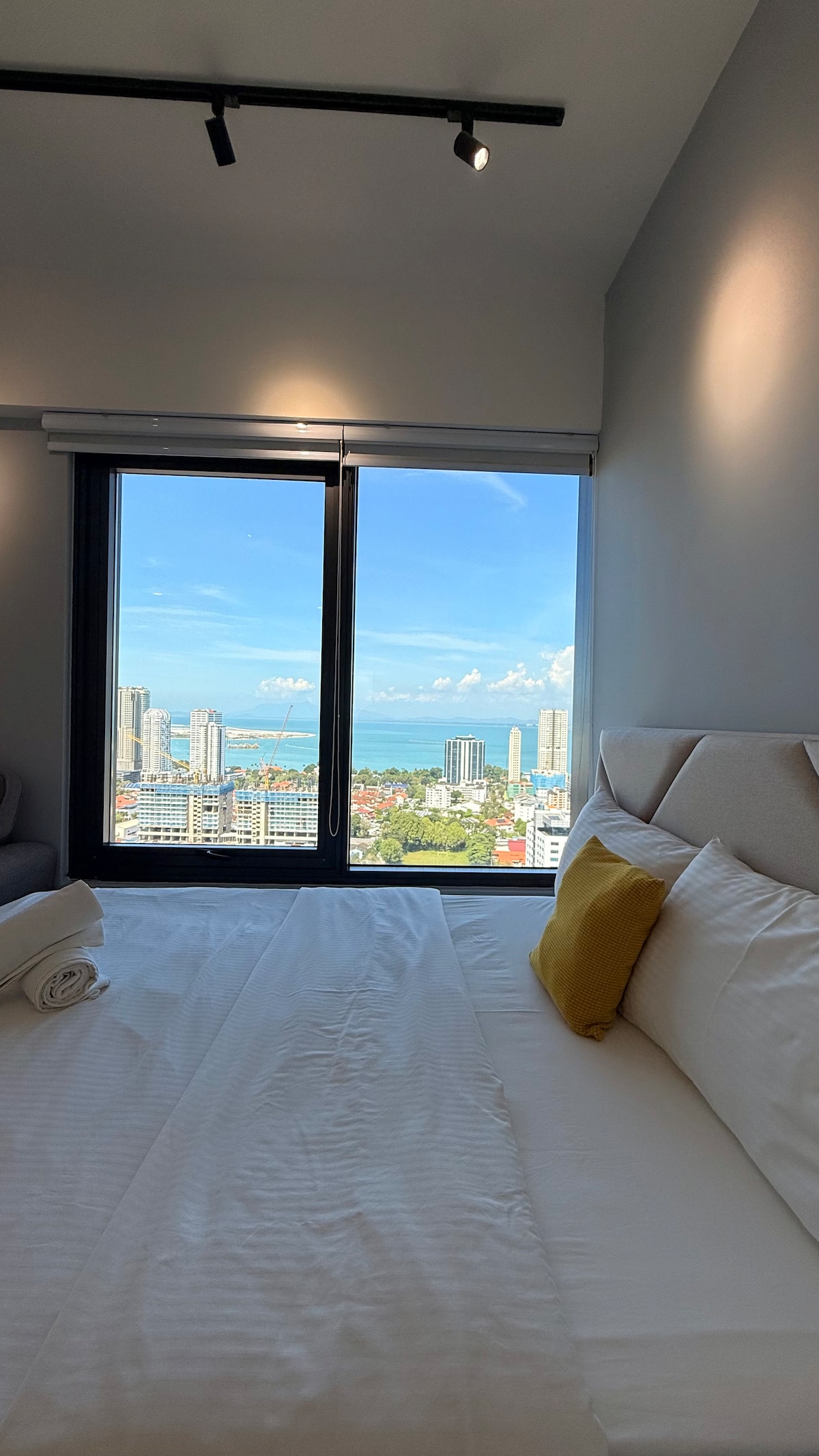 uma SUÍTE DELUXE COM VISTA PARA O MAR na localização PERFEITA Suíte encantadora e acolhedora com vista para o mar com NETFLIX, Wi-Fi de alta velocidade e DISPENSADOR DE ÁGUA POTÁVEL localizado a poucos km do centro da cidade e do Patrimônio Mundial da UNESCO. A pé: - Restaurante japonês/coreano/24 horas 7-11 Loja de conveniência no local, térreo - Barracas de comida, restaurantes, supermercado e mercado úmido De Carro: 5 km - Patrimônio da UNESCO/G'Town 6 km - Gurney Drive 8 km - Shopping Queensbay 14 km - Aeroporto Internacional 16 km - Praia de Batu Ferringhi