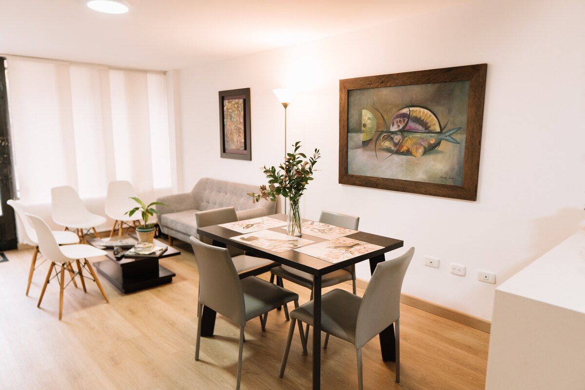 Apartamento moderno en zona residencial tranquila, ideal para parejas que buscan descanso y privacidad. Cuenta con habitación principal con cama queen y baño privado, además de sofá cama doble con acceso a segundo baño completo, cómodo para hasta 4 personas. Parqueadero privado, WiFi estable, y agua caliente. A 10 minutos en carro del centro y puntos turísticos. Disfruta café y aromáticas de cortesía para empezar el día con tranquilidad. Contamos con póliza hotelera.