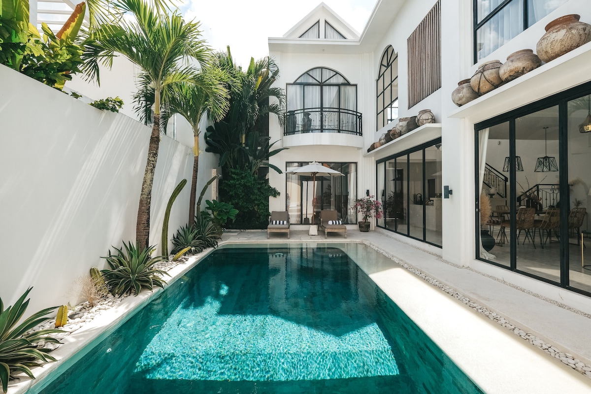 Luxury boho tropical 3 bedroom villa retreat. Super central only 5 minutes walking distance from Berawa Beach, all its attractions and trendy venues, like Finns and Atlas. also famous world class restaurants and boutiques. All bedroom with king size bed, ensuites, enjoy 5-star services, daily cleaning with full kitchen and your own private pool in privacy place. Family and small groups welcome! Sleep up to 6 people. Located in Berawa, Canggu a perfect escape to Bali island's elegance.