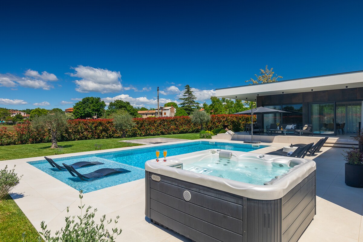 Villa elegante perto de Rovinj com piscina digna de fotografia, banheira de hidromassagem e sauna. Acorde com vistas exuberantes e panorâmicas para o vale. Ideal para casais e famílias, a uma curta distância de carro do parque de aventuras, do Parque Nacional de Brijuni, do parque de dinossauros, de cidades medievais e da gastronomia local. É uma verdadeira escapadela verde para quem quer voltar à natureza com todo o conforto da vida moderna. Totalmente equipado para cozinhar e entretenimento em 2600 m2 de jardim (futebol, bola de velocidade, badminton e diversão na piscina) para os seus filhos e entes queridos desfrutarem.