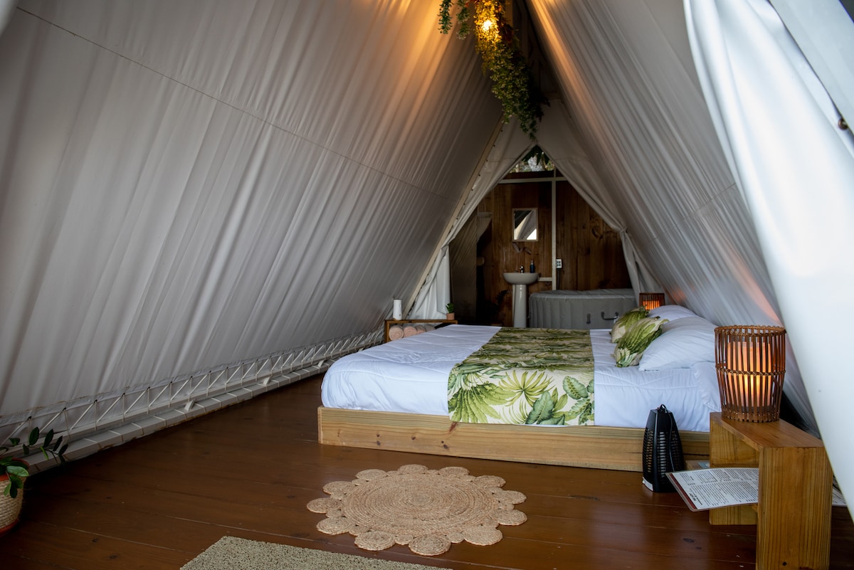Glamping na selva com banheira de hidromassagem, sauna, ioga e muito mais