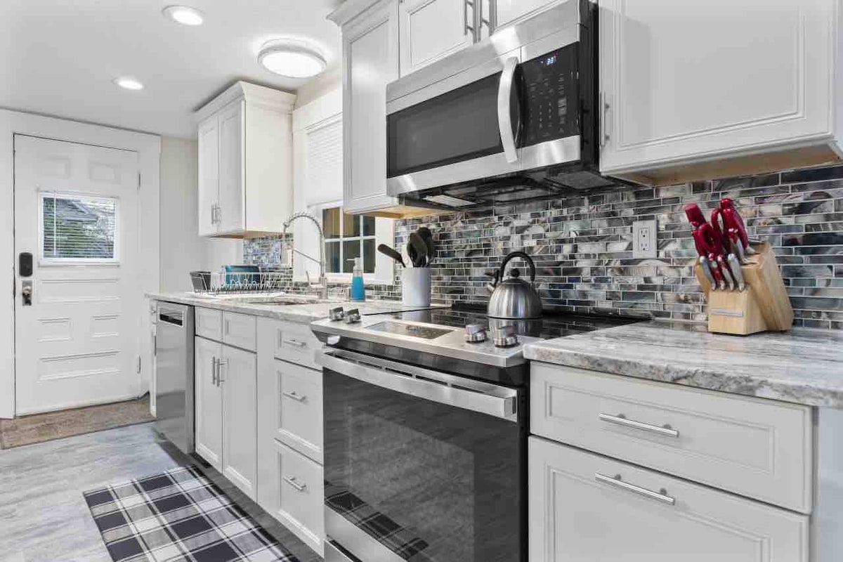 • Perfect for small families or couples, our signature A-Frame cabin features a modern interior gas burning fireplace, soaring ceilings, huge windows, stylish interiors, and all the comforts of home. • This cozy 1,100 square foot space comfortably accommodates up to four guests in two bedrooms (one with a King-size bed and the other with a Queen-size bed) and a shared bathroom. • 7 minute drive to downtown Freeport. • Proud to be ranked in the top 1% and voted Guest Favorite!