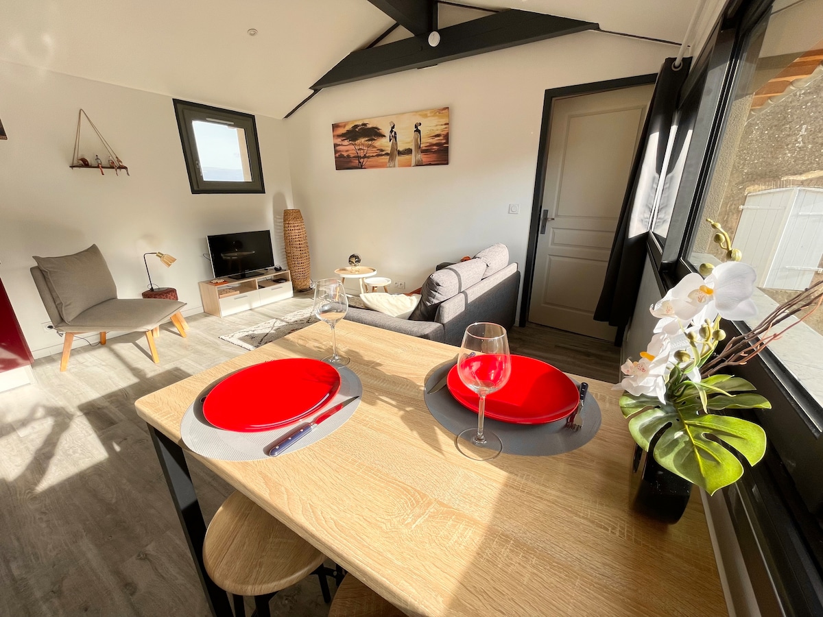 Uma microcasa no coração da Gasconha. De um só andar, climatizado, equipado e confortável, pode acomodar até 4 pessoas, incluindo uma sala principal com sofá-cama para 2 pessoas, uma cozinha totalmente equipada e mobiliada, banheiro com chuveiro grande, quarto com cama de casal 140x200, lençóis e toalhas fornecidos e uma despensa com máquina de lavar. Este alojamento é individual e independente, com um terraço privado e equipado com móveis de jardim. Estacionamento privativo e seguro.