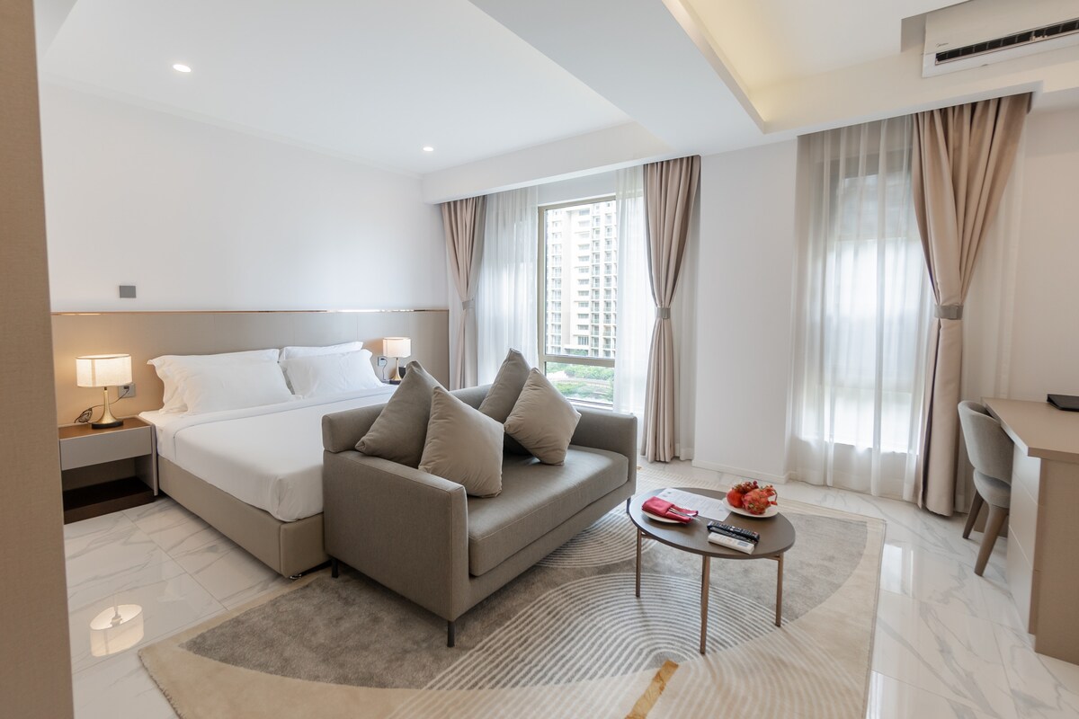 *Please note that for monthly stay (from 28 nights), there'll be an electricity charge at the rate USD 0.25/kwh. *Kindly message us if you need air port pick-up Situated on the 11th & 12th floors with spectacular city and river views, the spacious and bright 38sqm studio comes complete with a spacious balcony, a kitchen with modern appliances, a wall mounted dining table, and complimentary laundry service. Suitable for the single business executive or a couple who want to enjoy a relaxed stay.