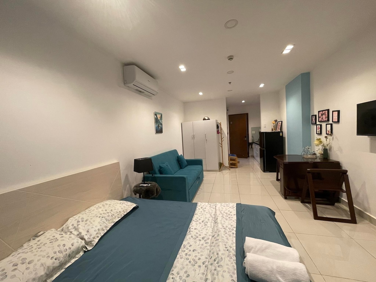 O apartamento é adequado para hóspedes e famílias que combinam viagens de negócios e férias. Dá aos visitantes a sensação de ficar em um hotel elegante, mas desfrutando de um ambiente familiar. - Cama king size 1,8 x 2 metros de largura e 1 sofá-cama 1,8 x 2 metros de largura para família de 4 pessoas. - 2 mesas de trabalho, 1 piano, TV de 58 polegadas com mais de 100 canais gratuitos: Netflix, HBO, Max, Esportes, - Área de cozinha, mesa de chá + mesa de jantar, frigobar, geladeira, máquina de lavar roupa - Piscina gratuita - 5 minutos para o aeroporto
