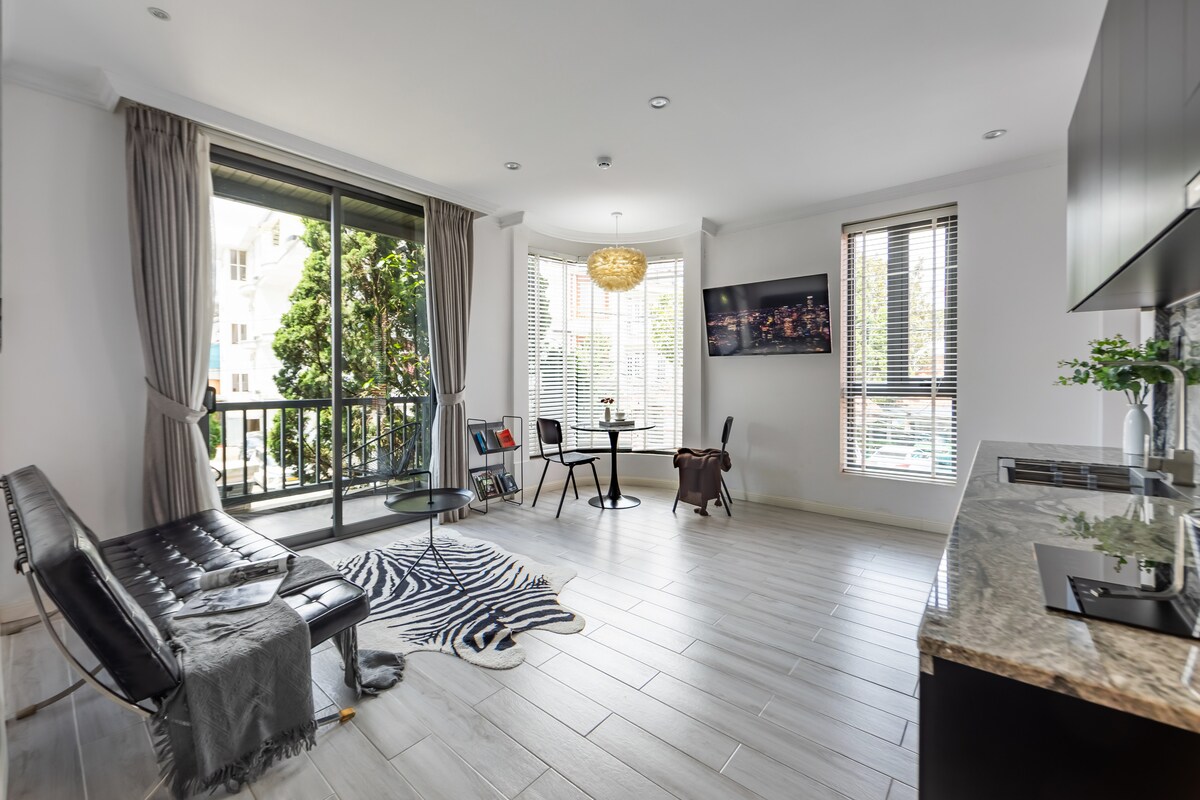 DISCOUNT 20% This is a modern condotel on 5th floor. Everything is totally new & clean. It's ideal to explore many tourist places in Da Lat in 5-10mins. - Living room | Bedroom | Bathroom & Balcony -King bed -Bathroom: tub, hot shower & full of essential -Elevator, air-conditioner, TV, wifi, hair dryer, fridge, kettle, dining table -FREE water bottle, coffee, tea -FREE motorbike & car parking -FREE cleaning service -Other services: laundry, rental motorbike/car, pick-up, tour -Free breakfast