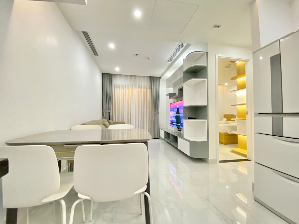 Apartamento de luxo 5* The Opera Residence Corner por ChiHome - Vista para o Rio Bason District 1, The LandMark 81, The Galleria, The Mett Office, District 2 Sala Thiso Mall. - Torre B, Scala, Nível 1x unidade 10 - Tamanho: 70m2 (unidade de canto) - Inclui 2 quartos, 2WC, confortável para ficar de 2 a 4 pessoas. - Smart TV de 65 polegadas com Netflix e YouTube - Sofá, poltrona, mesa de chá. - Mesa de jantar com 4 cadeiras - Utensílios de cozinha completos - Internet sem fios de alta velocidade disponível • Ar condicionado para toda a casa - Acesso 24/7 ao edifício