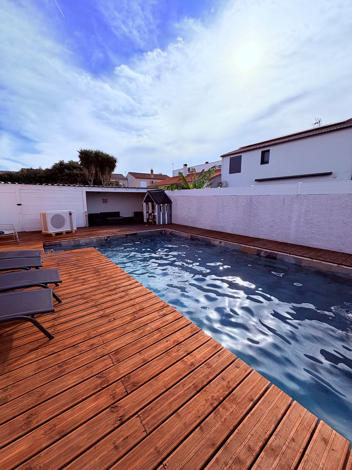 Moradia de férias com piscina exterior privada Relaxamento garantido com uma pérgula e cozinha de verão (churrasqueira plancha) A casa tem 3 quartos ( 2 camas em 160 cm e um sofá conversível), 2 casas de banho, 2 casas de banho,uma cozinha ,um ginásio e uma sala de estar de 40 m2 À chegada, as suas camas serão feitas e as toalhas serão fornecidas gratuitamente Aceitamos animais de estimação