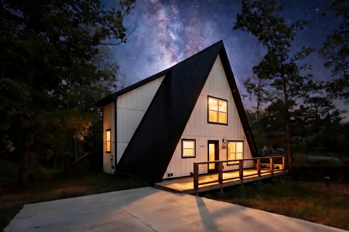 Apenas para casais. Relaxe neste espaço calmo e elegante. Construído em 2023, com comodidades topo de gama. Cabana independente com acesso ao lago, traga as suas canas de pesca. Não são permitidos reboques de barcos ou carros. Banheira de hidromassagem privada. Lareira a gás e TV ao ar livre. Assentos exteriores confortáveis e uma churrasqueira BLACKSTONE a propano. Jogo de Cornhole para o manter entretido. A sanita da casa de banho tem assento aquecido e bidé. Espelho com sensor de movimento e Bluetooth. Cama Queen Sleep Number. NÃO SÃO PERMITIDAS CRIANÇAS, BEBÉS ou ANIMAIS DE ESTIMAÇÃO