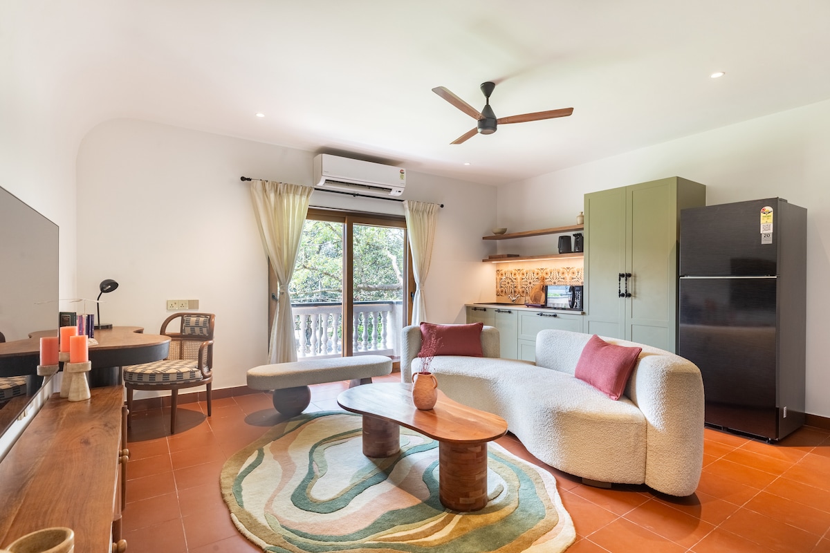 🌿 Your Peaceful Hideaway Near Candolim Beach Awaits! Tucked in lush greenery, this charming 1BHK apartment is a cozy escape where comfort meets elegance. With an airy, stylish living space and a serene bedroom for dreamy nights, it's your perfect Goan retreat. A perfect holiday home just minutes from Candolim Beach. Ideal for families, couples, solo travelers, or friends, this homely apartment features a bright living area, a comfortable bedroom , a kitchen &a private balcony