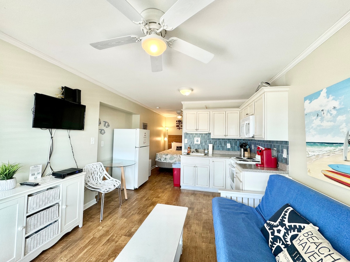 Espaço pequeno e aconchegante - Grande valor! Estúdio recém-remodelado Passos da praia de Sugar Sand Atlantic Uma cama queen size Cozinha totalmente equipada com geladeira, fogão, micro-ondas, cafeteira Keurig e cafeteira elétrica, torradeira, liquidificador, panelas, frigideiras, utensílios, pratos, xícaras Banheiro moderno Wi-Fi gratuito TV a cabo gratuita Roupa de cama incluída (toalhas e lençóis) Estacionamento gratuito Acesso à piscina privativa Churrasqueira à carvão à beira da piscina (traga seus próprios briquetes) Instalação de lavanderia com cartão de crédito ao lado da sala de jogos. OBSERVAÇÃO: toalhas de praia NÃO FORNECIDAS
