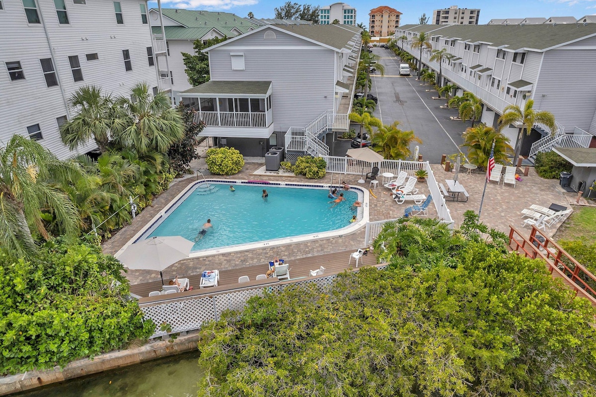 New, 2000 sq ft/3 Bedroom/3 Full Bathrooms 2 living rooms/modern townhome with heated salt water POOL located near a canal and the gulf just two blocks from the beach. Please note the pool is shared with the other side of the duplex. You can enjoy full view of the canal and partial views of the gulf from the balconies and the rooftop! Walking distance to the beach, restaurants, and volleyball. Close to Johns Pass, 2 miles. Please ask for the golf cart availability and a fee.