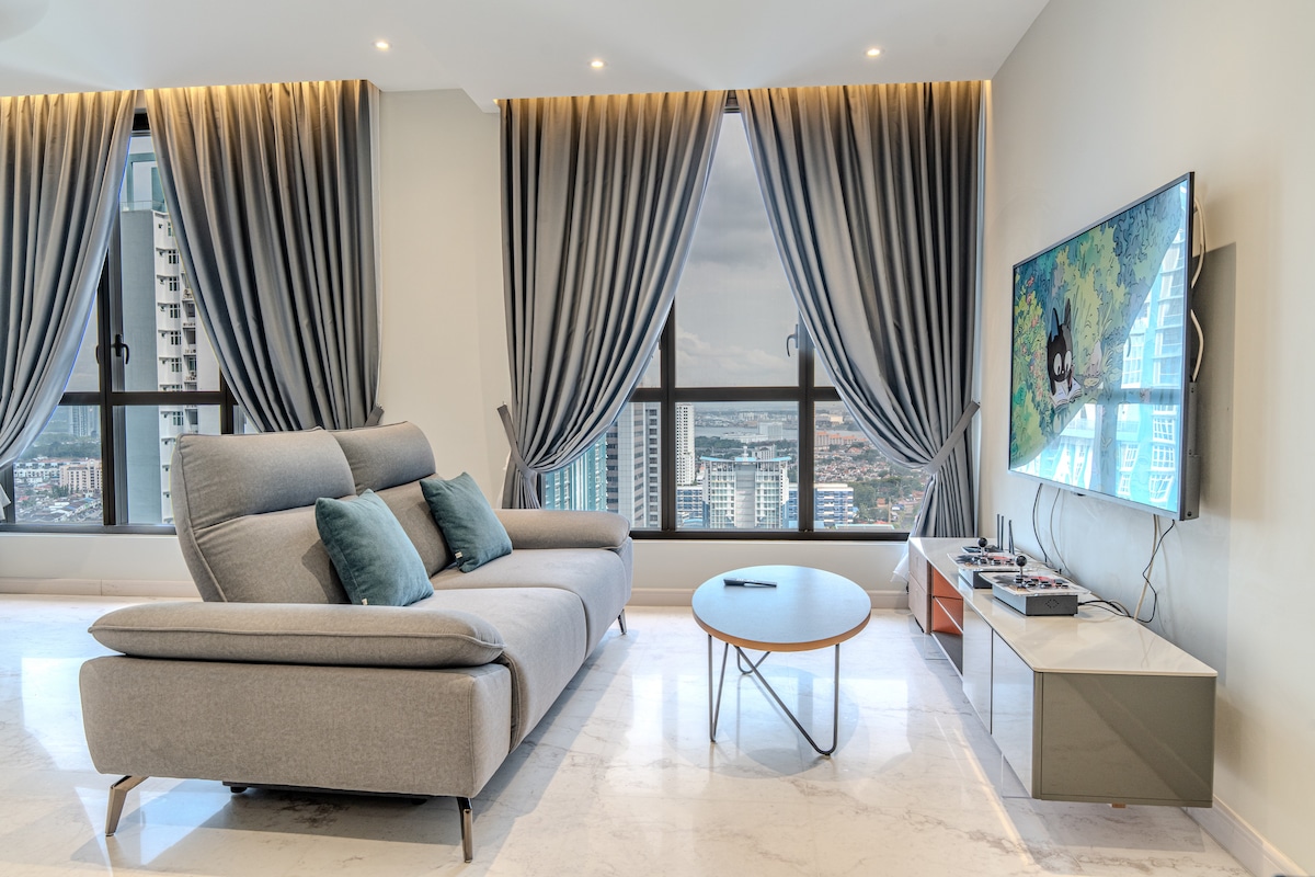 Setia Sky88, o condomínio de luxo com um design icónico no coração de Johor Bahru. Desfrute da euforia de uma vida luxuosa ao ficar no nosso espaço agora! A nossa unidade de 1 quarto fica no piso 24, com vista incrível para a cidade de JB! Um dos destaques desta unidade é a nossa cadeira de massagem especial! Pode desfrutar enquanto fica aqui Também temos uma Smart TV de 55 polegadas com Netflix e também jogos Arcade para o seu entretenimento! ✔ 5 minutos para o KSL City Mall ✔ 8 minutos do Midvalley Southkey Mall ✔ 10 minutos para JB CIQ