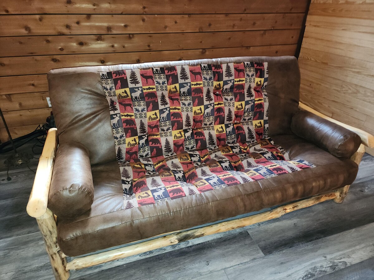 Olá a todos! Estamos a oferecer uma pequena cabana (que estava programada para ser uma parte do nosso celeiro). Tem 10x12 pés, mobilado com um sofá-cama com dois colchões individuais. Há uma televisão retrô com DVD, um mini frigorífico, um micro-ondas, uma máquina de café e uma chapa quente. Na nossa entrada e atrás da nossa casa, tem acesso a uma casa de banho ao ar livre e acesso à Internet. Atrás da cabana tem uma fogueira privada, um deck de rede, uma casa de banho de compostagem e uma área coberta com uma grelha de argila numa área de cozinha ao ar livre.
