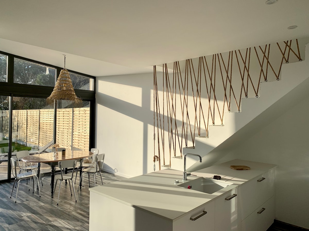 Única ! Casa de praia de design em Morbihan, na Bretanha! Acesso direto à praia no final do jardim, A casa é nova, totalmente equipada e vocês são os únicos ocupantes das instalações, Vista direta da praia /do mar a partir da sala de estar, da cozinha, do terraço, do terraço e de um dos quartos no andar de cima. Lençóis, toalhas e limpeza incluídos, máquina de lavar e secar roupa. Muitas atividades nas proximidades: caminhadas, ciclismo, caiaque no mar, kitesurf, escalada em árvores, visitas culturais, passeios de barco...