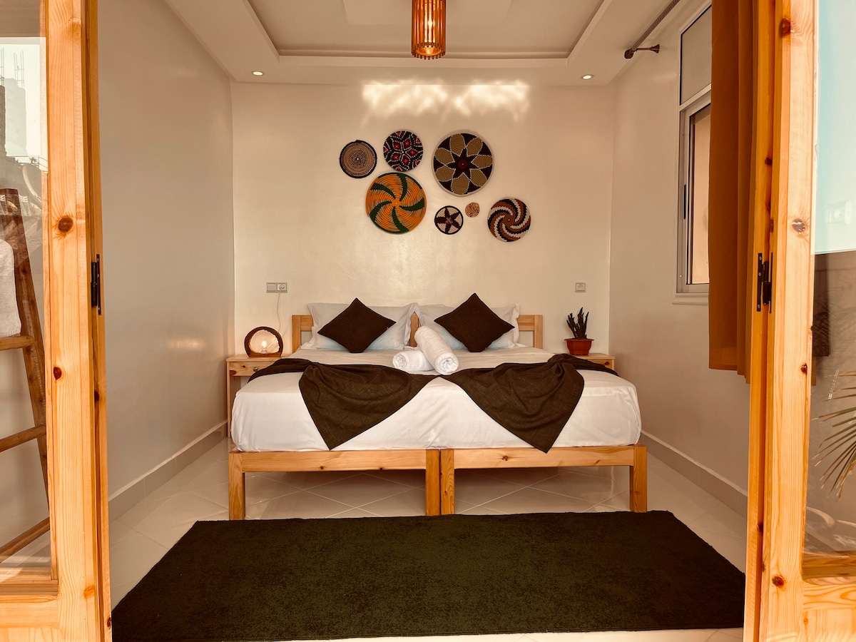 Bem-vindo ao nosso acolhedor estúdio tradicional de madeira, a poucos minutos das belas praias de Tamraght e Taghazout. Perfeito para dois, oferece duas camas individuais e decoração quente e autêntica inspirada no sul de Marrocos. Fique connosco numa pousada acolhedora, relaxe no terraço e participe em aulas diárias de surf nas proximidades. Explore joias locais como as dunas de Timlalin, o mercado Souk El Had e o Vale do Paraíso. Desfrute de calma, cultura e surf num só lugar.