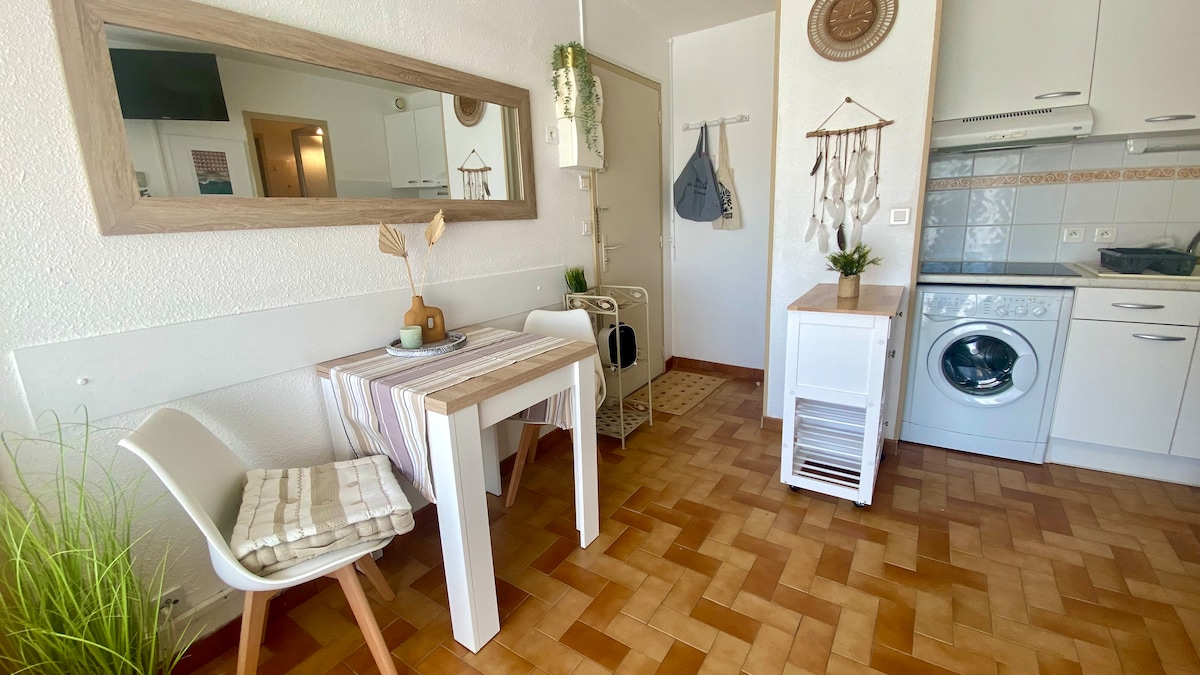 appartement climatisé refait à neuf, en rez de chaussé de 34m3 avec un petit jardin, cuisine équipée ,lave linge, lave vaisselle, plaque induction, micro onde , cafetière senseo , deux chambres avec lit double , pièce à vivre BZ 2 places. Dans le jardin Plancha , table de jardin, transats 100 m de la plage , et 5min du centre de Narbonne -plage et de tous les commerces