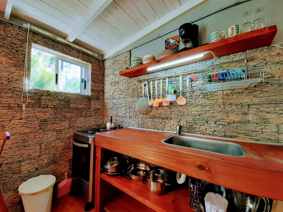Quincho Jardín, fue diseñado y pensado para nuestros huéspedes. Está a pocas cuadras de la playa rodeado de Naturaleza. Cuenta con patio cerrado con barbacoa independiente y amplio deck techado. Tiene cómodo somiers de dos plazas y un sillón cama, todo integrado. Una kitchenette completa. Y además un hermoso y amplio baño con bañera. Tiene WIFI, TV , Caja de Seguridad, Aire Acondicionado ❄️ y estufa a leña 🔥. En Otoño-Invierno estamos con Desayuno casero ☕️ incluido y leña de Cortesía.