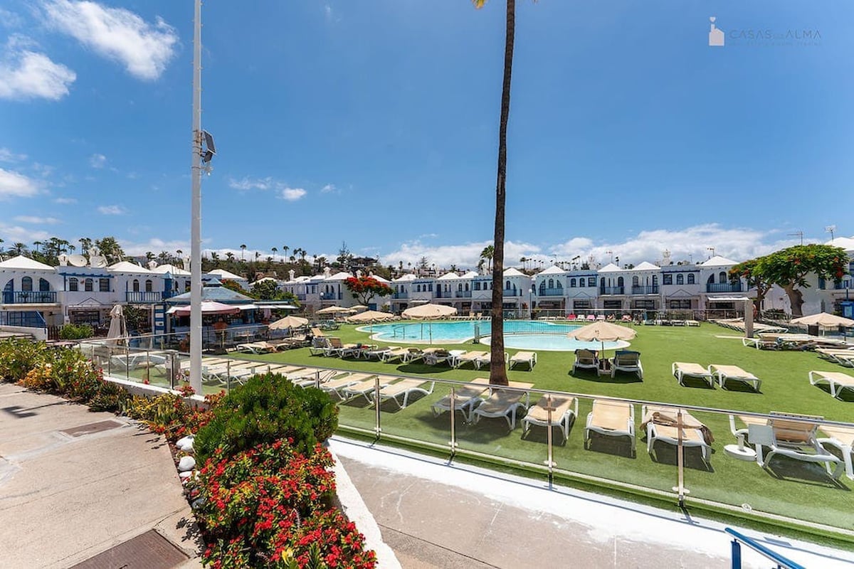 Bungalow Precioso completamente renovado. Estacionamento gratuito, Wi-Fi gratuito, equipado para passar férias com total autonomia. Máquina de lavar roupa, máquina de lavar louça. Pode acomodar até 2 adultos e duas crianças ou três adultos (quarto com 2 camas + sofá-cama 2 quadrados). Na residência existem serviços de Bar/Restaurante, 3 piscinas (gratuitas para residentes e hóspedes 10:00/19:00) 4 novos campos de Padel e um centro de ioga holístico (Yoga Alliance School Maspalomas Lake).