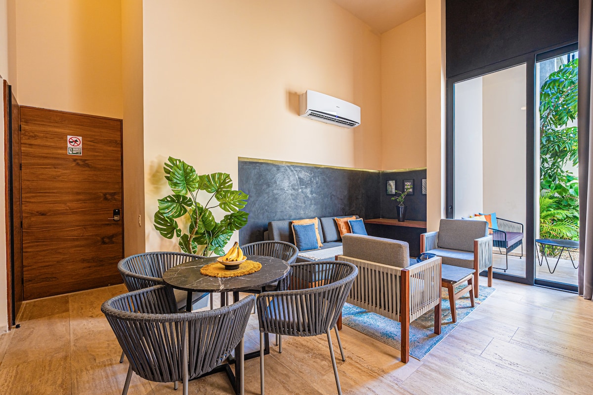 Experience a unique stay in this modern and elegant apartment 🏙️✨ located in one of the most exclusive areas of Playa del Carmen 🌴. Surrounded by restaurants, bars, and boutiques 🍸🍽️🛍️, you'll be just minutes from the beach 🏖️ and the vibrant Avenida 38. Its contemporary design, comfort, and prime location make it the ideal space to relax, enjoy, and experience an unforgettable Caribbean vacation 🌞💙