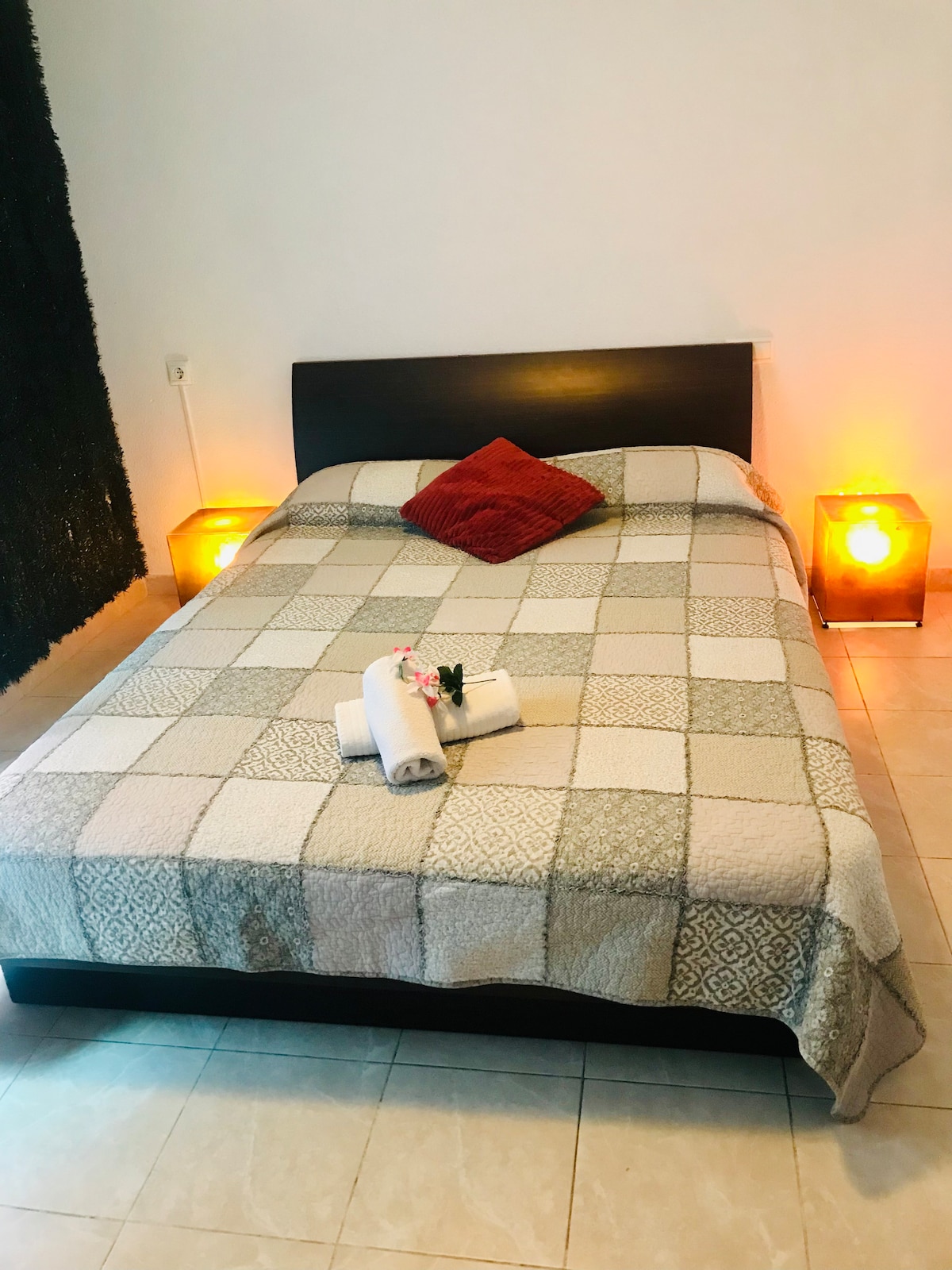 É um bungalow de 3 andares, o que significa que há total independência em cada andar por ter a sua própria casa de banho separada em cada andar, com 2 quartos em cada um, com um total de 4 quartos e 3 casas de banho, terraço de 60 metros com churrasqueira. Está localizado numa boa zona, a poucos metros da praia, com supermercados, um pacote temático infantil, zona desportiva. Moro a cerca de 20 km de distância e estou disponível para qualquer tópico que possa surgir, o meu propósito é que repita a estadia.