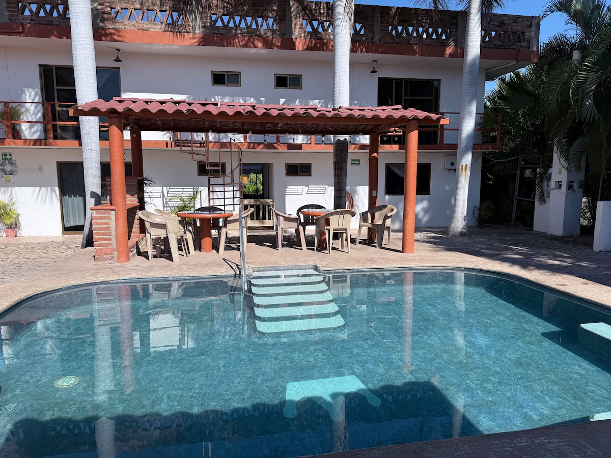 Bangalô em Punta Perula, ideal para viagens a dois, com amigos ou familiares. Desfrute de sua jacuzzi privativa. Localizado em um complexo turístico onde compartilha áreas comuns e piscina com outros 3 bangalôs e uma casa. Nós nos esforçamos para manter um ambiente familiar e agradável. A apenas 3 ruas e meia da praia e 3 ruas da praça central.