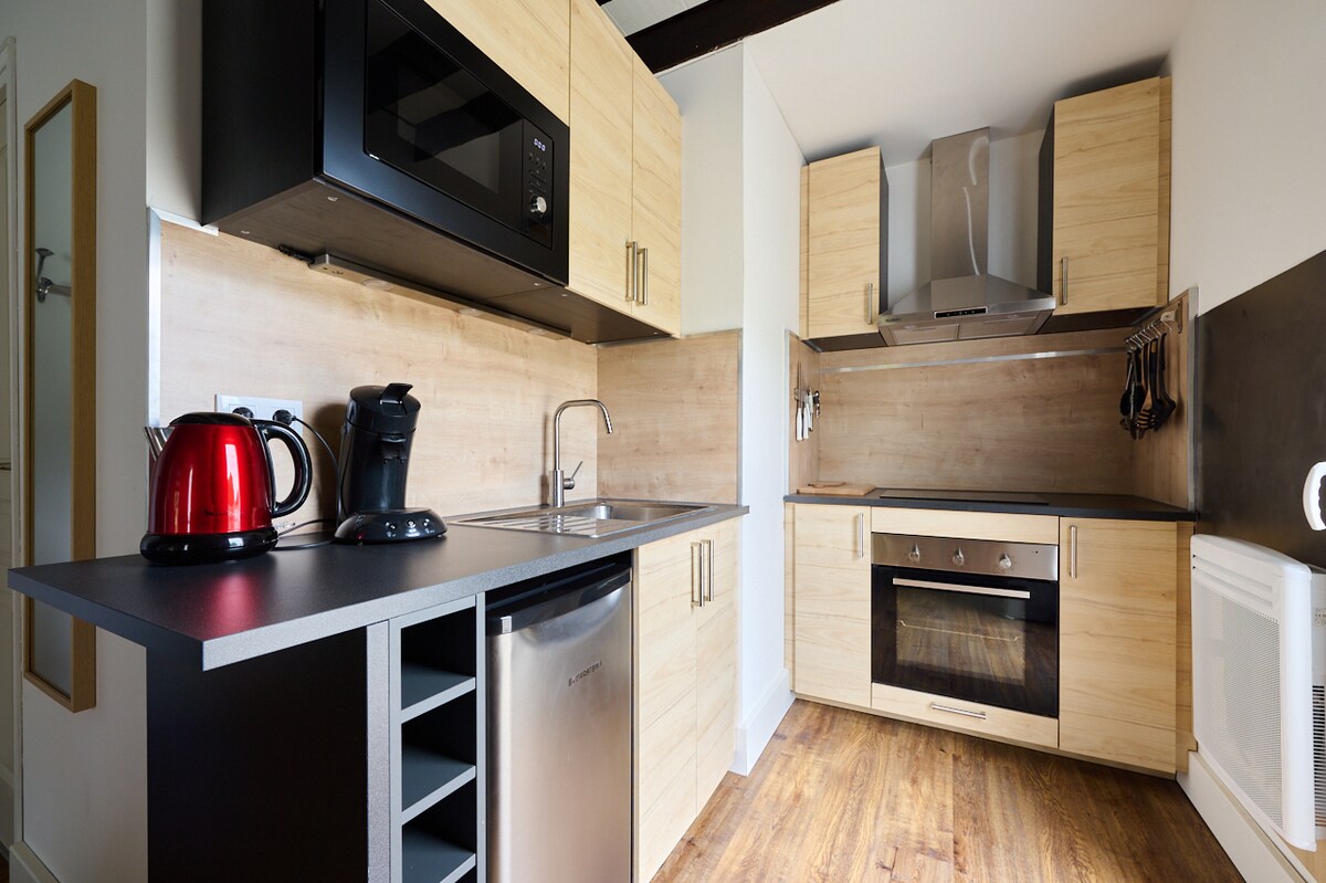 Nosso espaço recém-reformado de 33 m² tem ar condicionado e fica a uma curta caminhada do centro histórico e encantador de Dijon. Em um pequeno edifício separado atrás da nossa casa, você terá sua própria sala de estar/cozinha, quarto separado e banheiro. Há estacionamento público gratuito na rua em frente à casa. Você estará bem ao lado do Palais des Congrès e do Auditório, e a uma curta viagem de bonde da estação de trem, universidade e hospital. Supermercados e outras lojas nas proximidades. Nós também falamos francês.